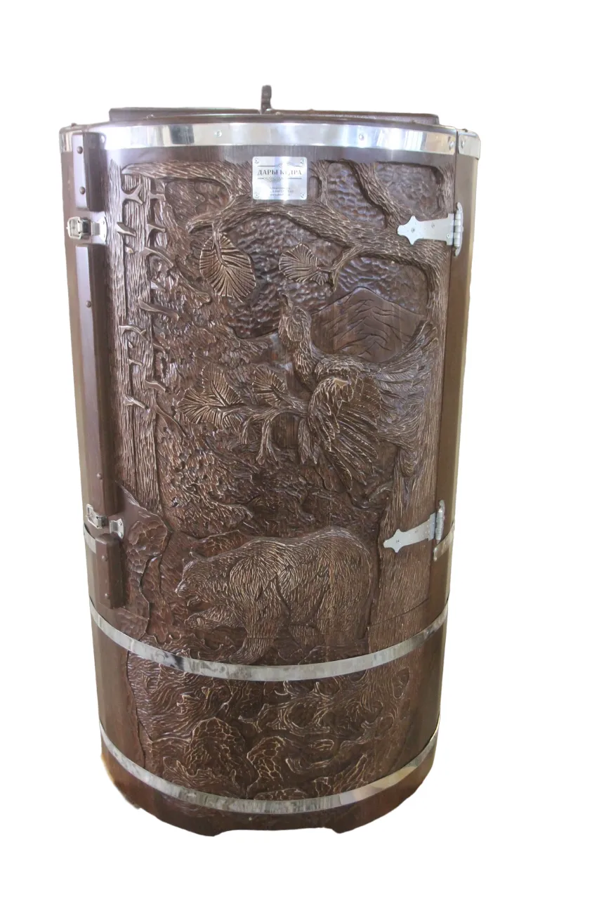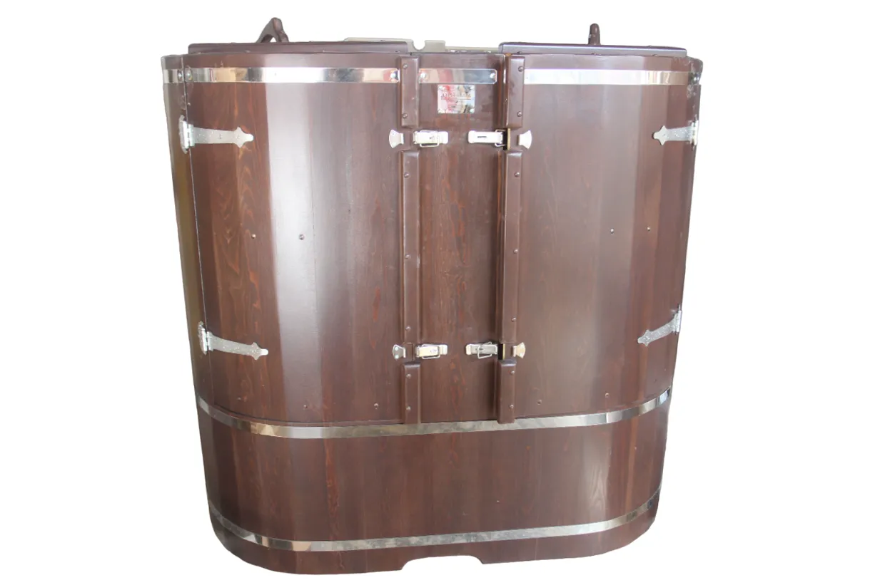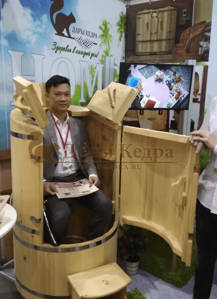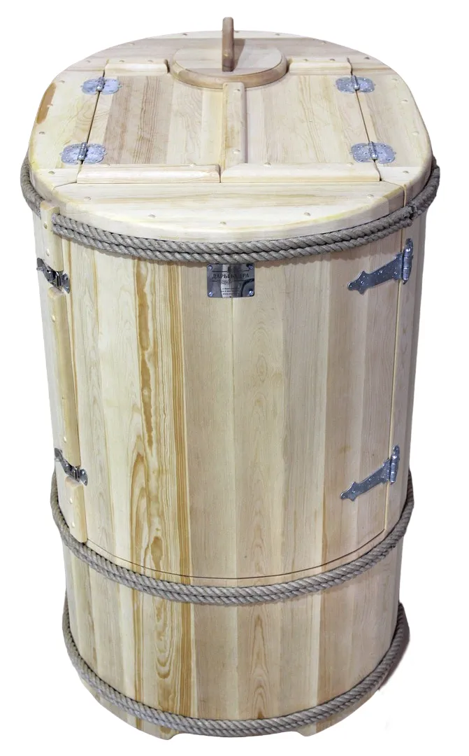 Квадратная двухрежимная фитобочка из кедра может быть использована как инфракрасная сауна и парная. Карбоновые излучатели отвечают за сухое парение, они находятся на внутренней стороне дверцы и задней стенке фитобочки. Влажное парение происходит за счет поступления горячего пара в фитобочку через паропровод. Толщина стенок составляет 40-45 мм, что позволяет увеличить срок службы изделия. Откидная дверь бочки во время открывания фиксируется внешней подставкой - опорой, которая в закрытом состоянии складывается и не занимает лишнее пространство. Во время парения человек сидит внутри кедровой бочки, а голова находится снаружи. Благодаря этому исключается возможность перегрева. Встроенная ручка на двери делают эксплуатацию фитобочки более удобной.