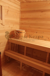 Это классическая прямоугольная модель бани с двумя отделениями: парилкой и раздевалкой. Для удобства пользования раздевалка оснащена лавочкой и вешалкой. Парилка оборудована двухуровневым открытым полком и печью. За счет небольшой конструкции баня нагревается в течении 30 минут. Ее можно заказать как в готовом, так и в разборном варианте. В разборной модели готовые щиты из кедра быстро собираются в полноценное строение, что также позволяет исключить лишний строительный мусор. Каркасно-щитовая баня не требует полноценный фундамент, поэтому при необходимости ее можно перенести в другое место.