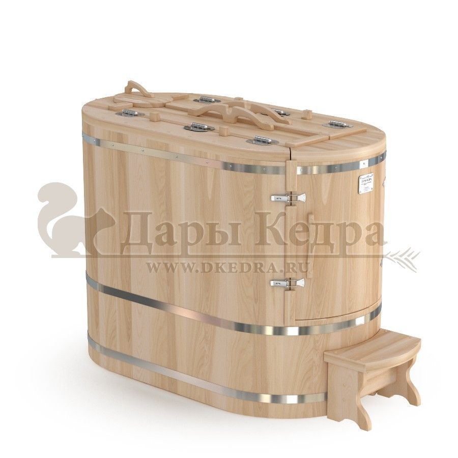 Кедровая фитобочка полулежачая - это мини парная, которую можно использовать не только в спа-салонах, но и дома. Модель этой бочки наиболее комфортна, так как позволяет принимать процедуры полулежа. Толщина стенок составляет 25 мм. Фитобочка оборудована откидными створками, дверцей и отверстием для головы. Во время парения человек находится внутри кедровой бочки, а голова снаружи. Благодаря этому исключается возможность перегрева. Подлокотники, подспинник из кедра и внутренние ручки делают эксплуатацию фитобочки более удобной.