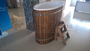 Это купель с внутренней овальной чашей, которая изготовлена из современного прочного и термоустойчивого материала (композита). Форма чаши обеспечивает комфортную посадку внутри изделия. Для удобного использования купель оснащена приставной лестницей. Обручи из нержавеющей стали декорируют купель с композитом и равномерно распределяют нагрузку во время процедур.
